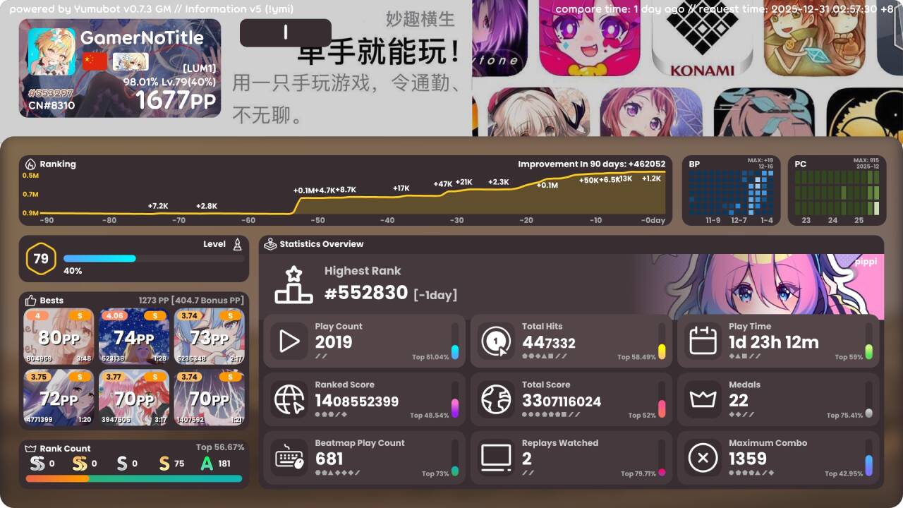 然后今年我重新开始玩了 osu!,并且现在成绩已经很不错啦,打大多数 3* 图没啥问题,但是 4* 图还有待提高
